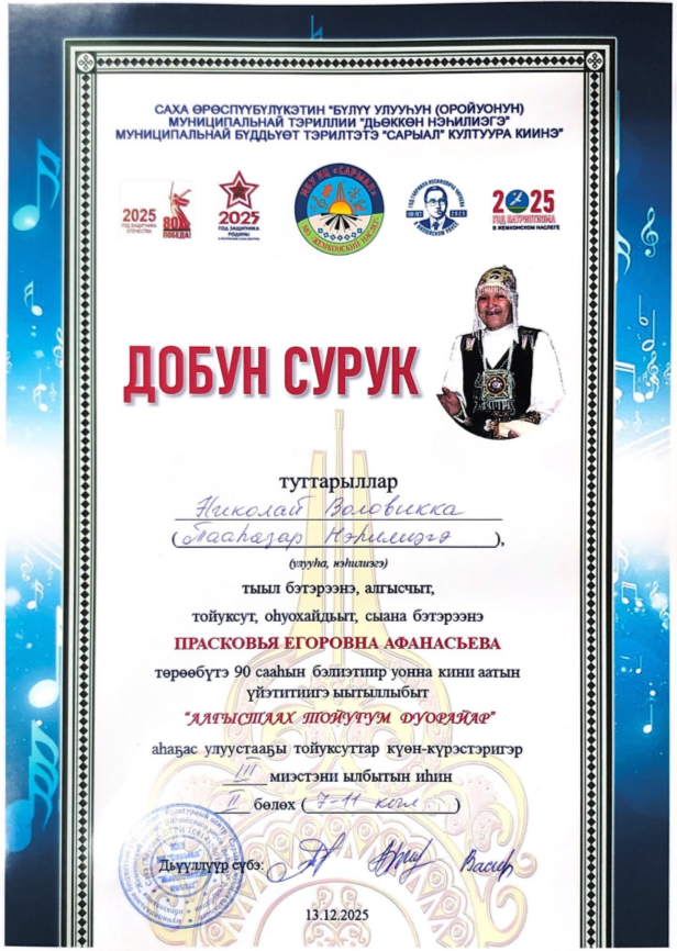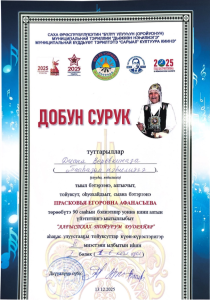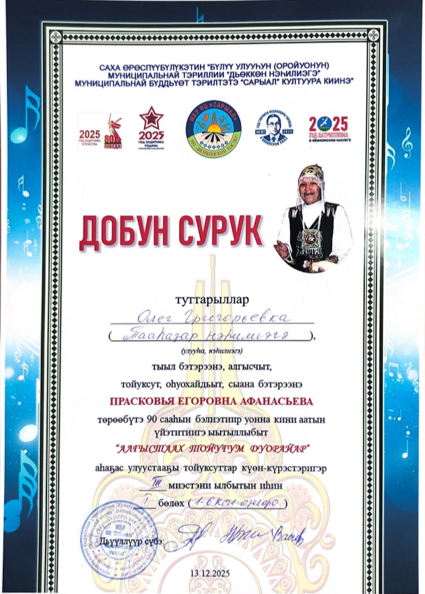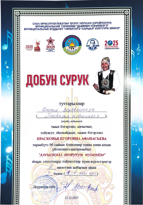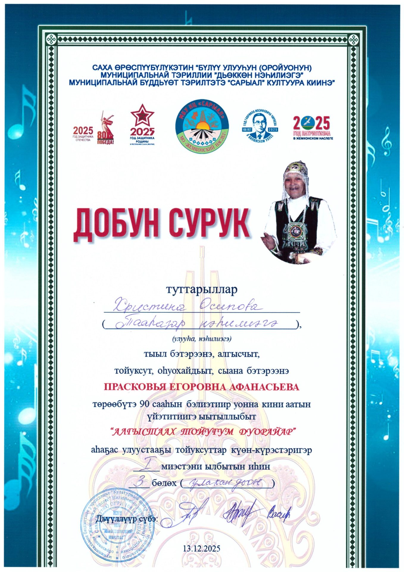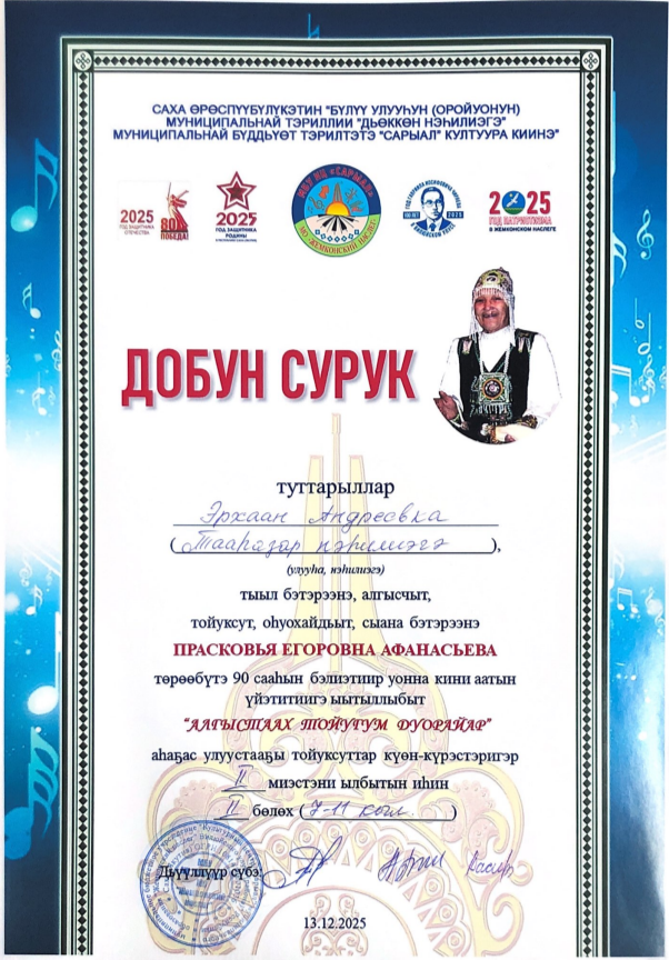 Тыыл бэтэрээнэ, алгысчыт, тойуксут, оһуохайдьыт, сыана бэтэрээнэ Прасковья Егоровна Афанасьева төрөөбүтэ 90 сааһыгар уонна кини аатын үйэтитиигэ