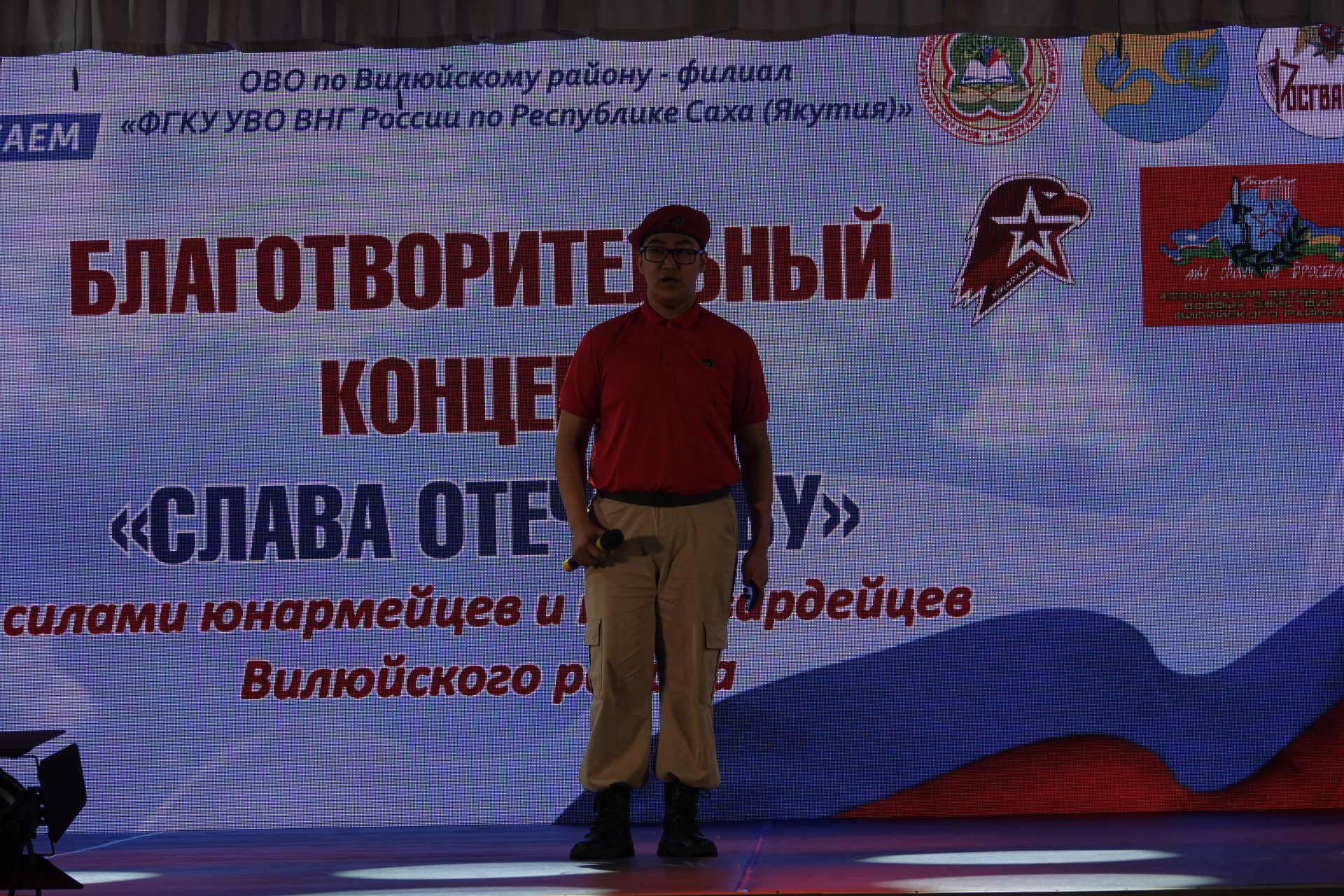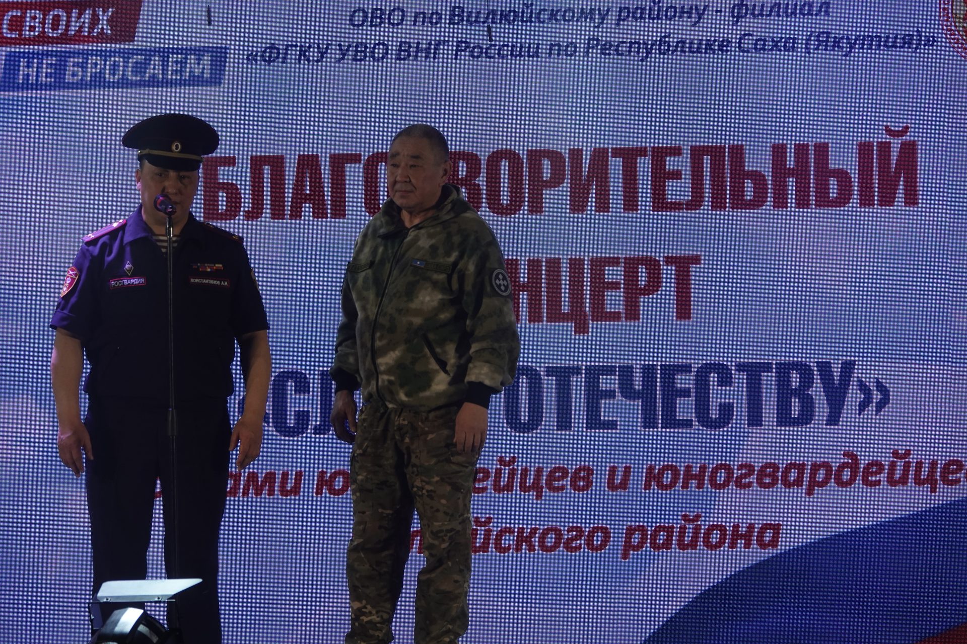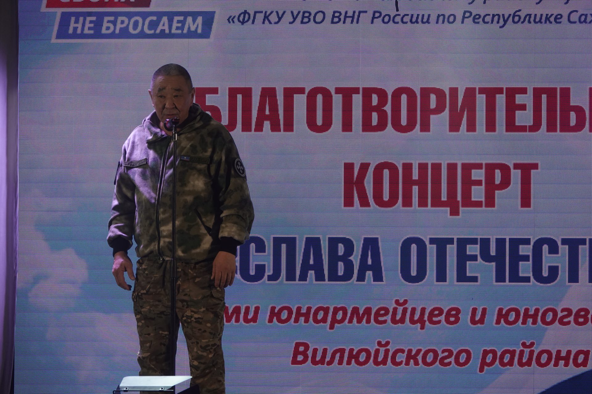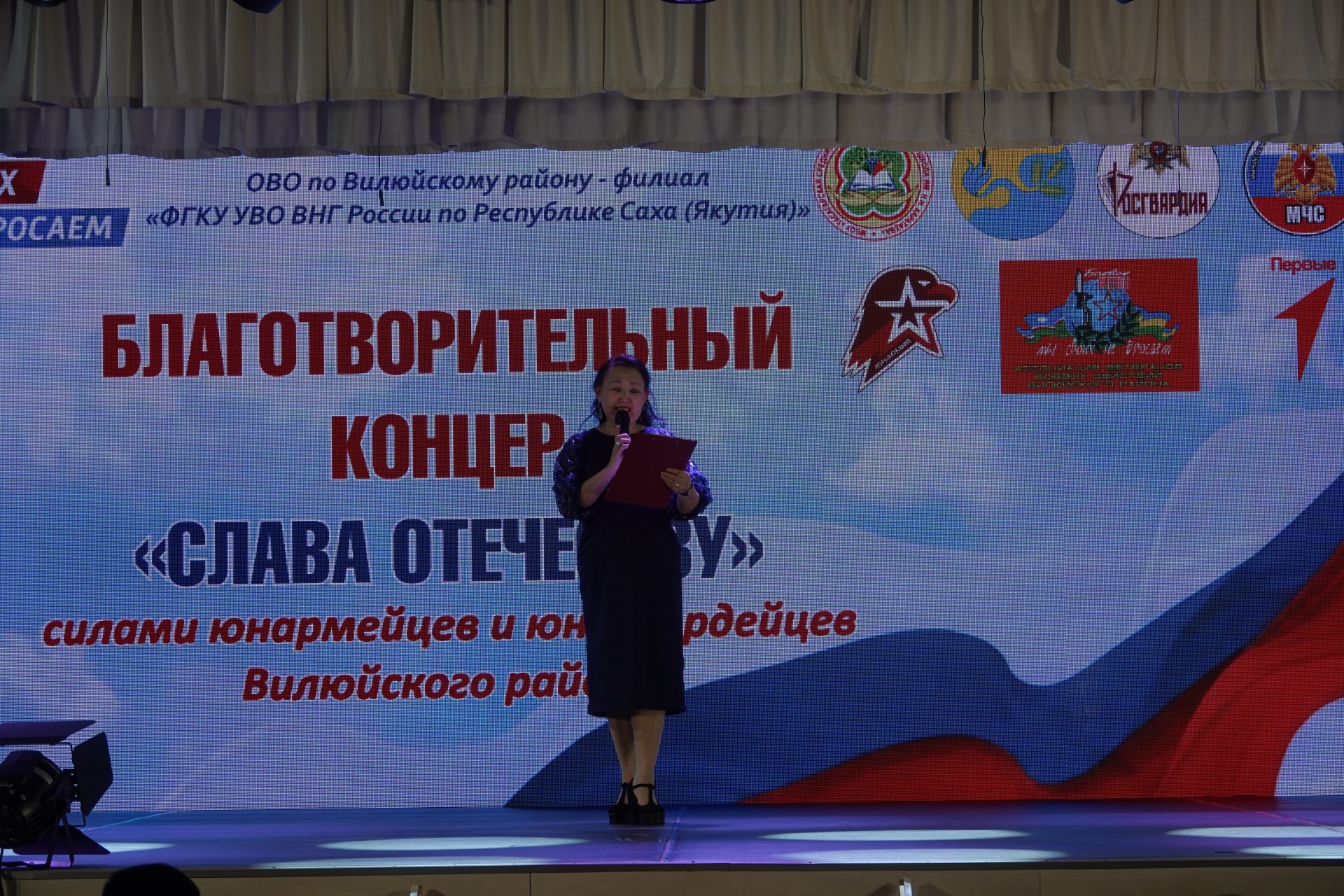 Олунньу 20 күнүгэр Аҕа дойдуну көмүскээччи күнүн көрсө улуустааҕы росгвардия уонна юнармия кылаастара “Эйгэ” норуот айымньытын Дьиэтигэр “Служу Отечеству” аһымал кэнсиэрт тэрийдилэр. Кэнсиэртэн киирбит 38.500 солкуобай харчыны анал байыаннай дьайыыга сылдьар байыастарга ыыттылар. Оҕону кыра сааһыттан патриотическай өйгө-санааҕа, тыыҥҥа иитии учуутал үлэтин биир сүрүн хайысхатынан буолар. Учуутал уонна төрөппүт утумнаахтык ыытар үлэлэрин түмүгэ – Ийэ дойдутугар бэриниилээх, төрөөбүт дойдутун туһугар ис сүрэҕиттэн кыһаллар, дойдутун, дьонун аатын түһэн биэрбэт туһугар олорор киһи иитиллэн-такайыллан тахсыахтара.