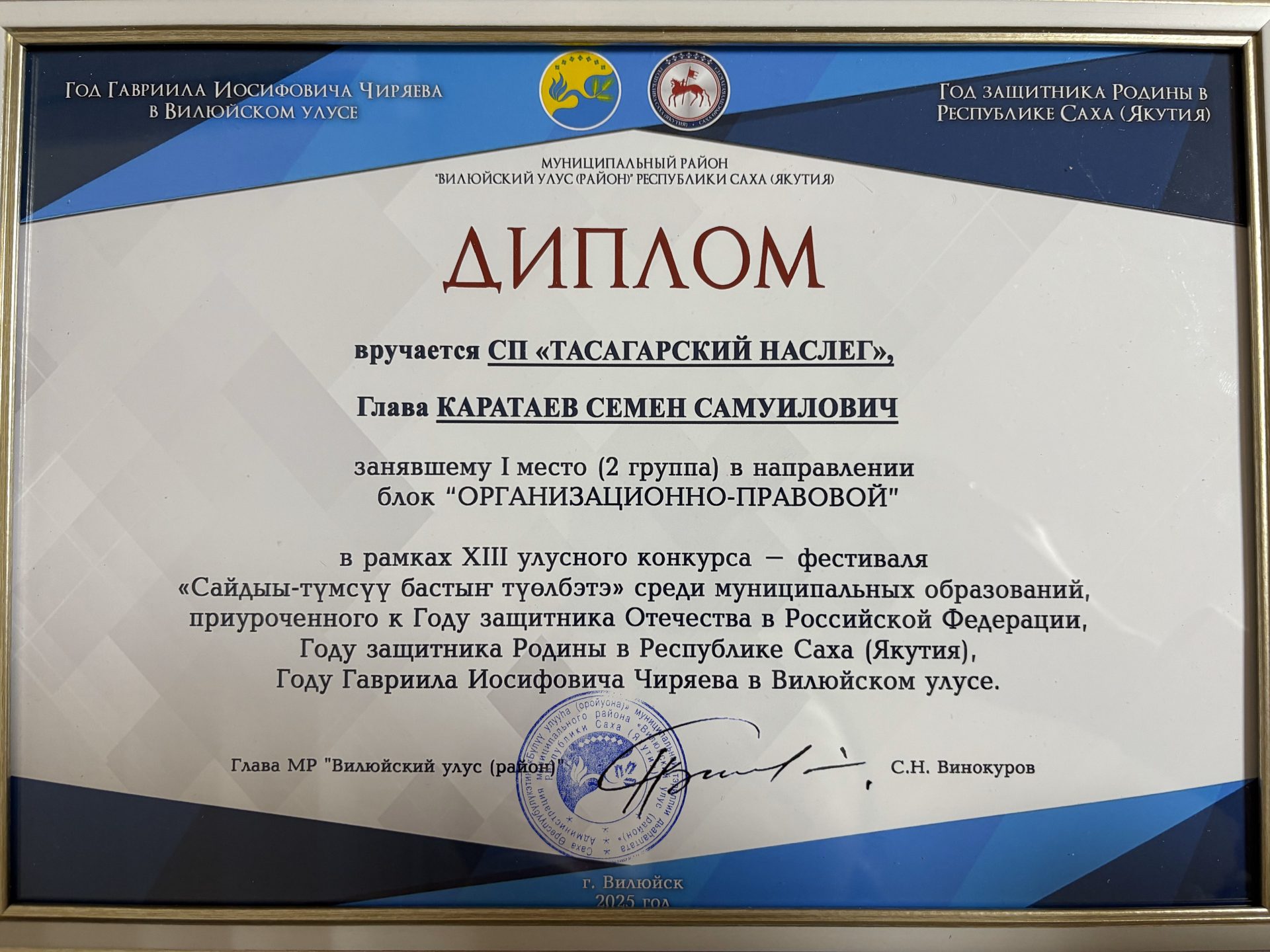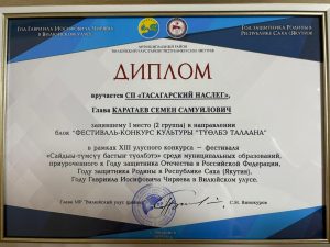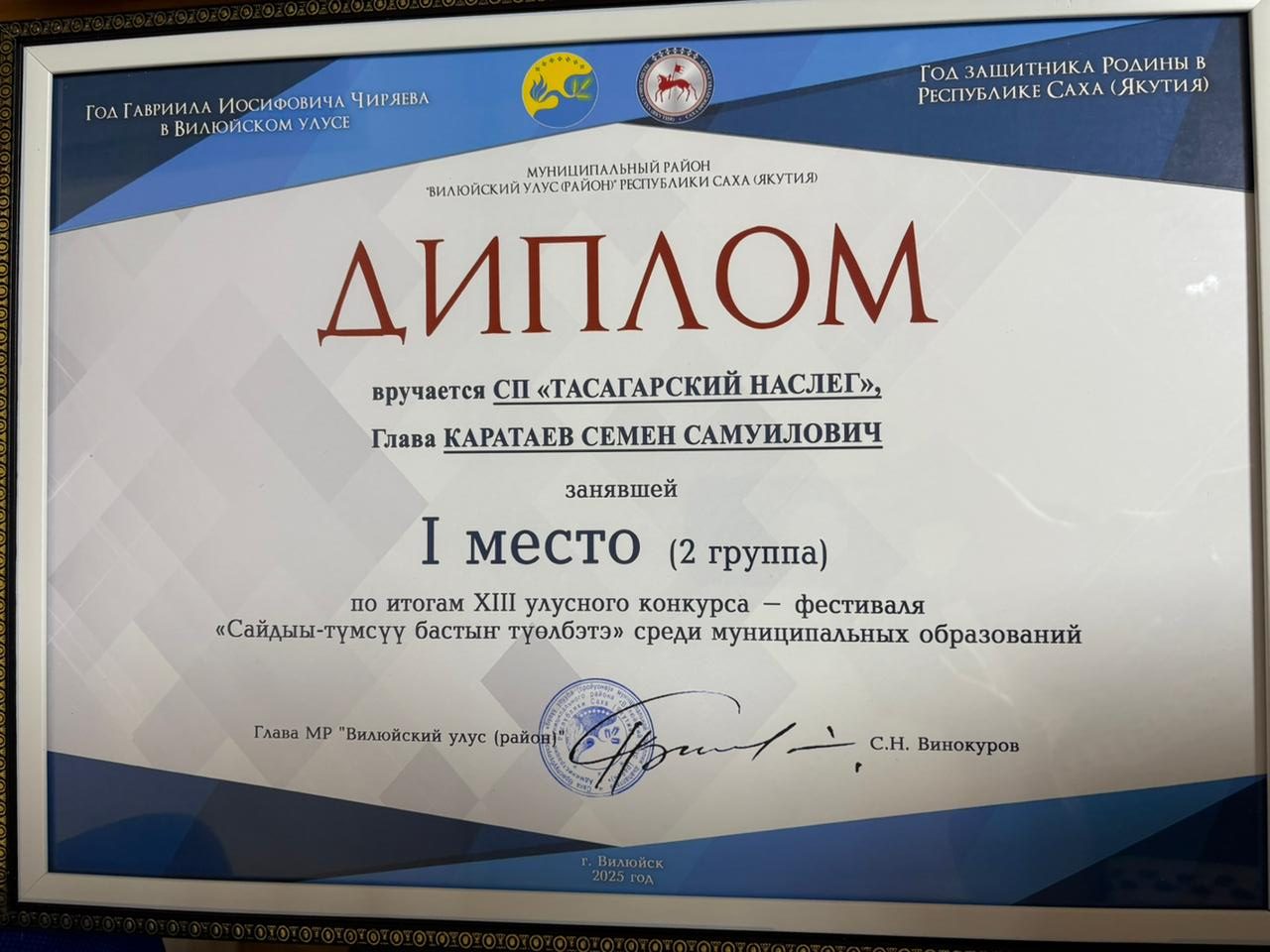 Итоги XIII улусный конкурс-фестиваль среди муниципальных образований, приуроченный к Году защитника Отечества в Российской Федерации, Году защитника Родины в Республике Саха (якутия), Году Гавриила Иосифовича Чиряева в Вилюйском улусе.“Сайдыы-түмсүү бастыҥ түөлбэтэ”- Тасагарский наслег ПОБЕДИТЕЛЬ.