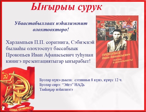 Сэтинньи 8 күнүгэр күнүс 12 чаастан «Эйгэ» НАДЬ биир дойдулаахпыт, төлөннөөх сүрэхтээх бассабыык Прокопьев Иван Афанасьевич туҺунан кинигэ биҺирэмигэр ыҥырабыт. Кэлиҥ, сылдьыҥ, нэҺилиэкпит историятын билиҥ, хаҥатыҺыҥ.